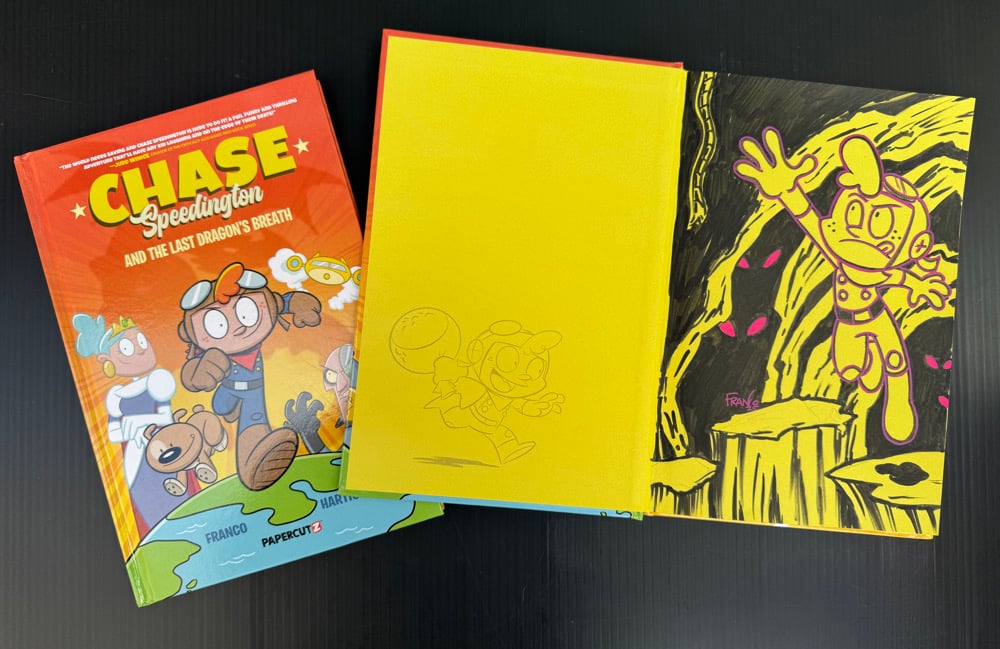 Original drawing by Franco on inside page of the Hardcover Book 1 of CHASE SPEEDINGTON and The Last Dragon’s Breath!
